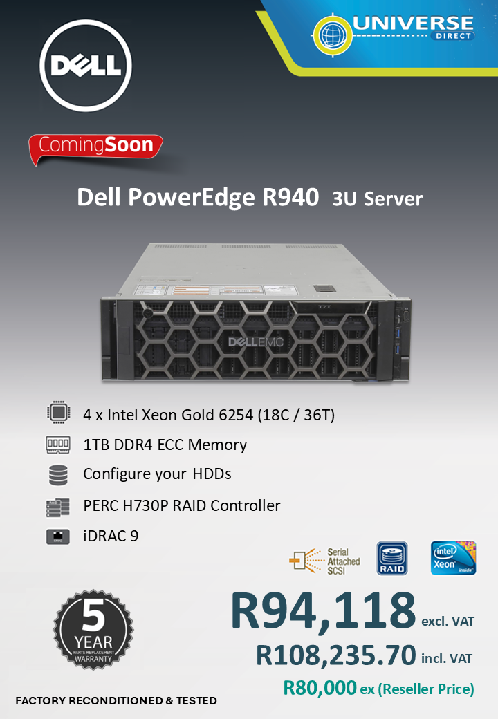 The Dell PowerEdge R940 is a high-end, 4-socket, 3U rack server designed for mission-critical workloads like in-memory databases, data analytics, and high-performance computing.