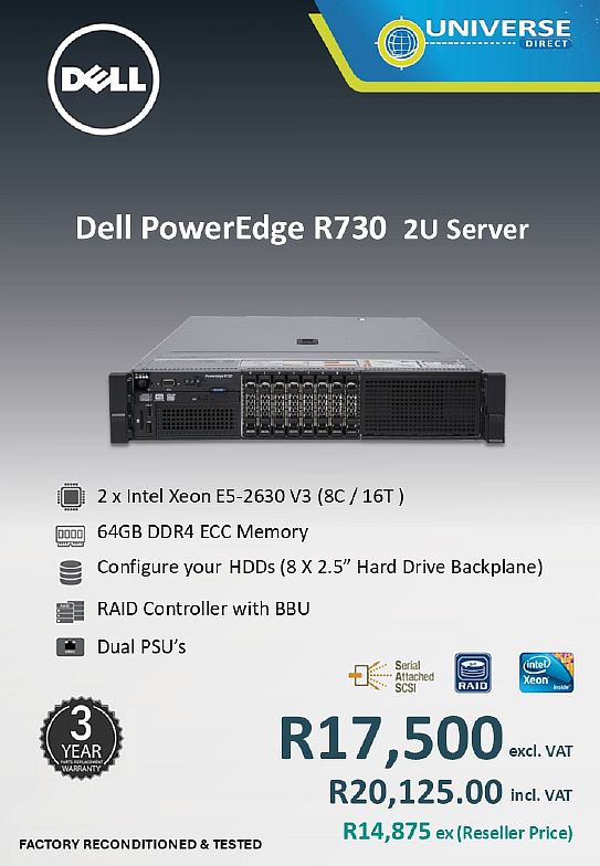 R730 SVR 2XN E5-2630 V3 8C/64GB/NOHDD