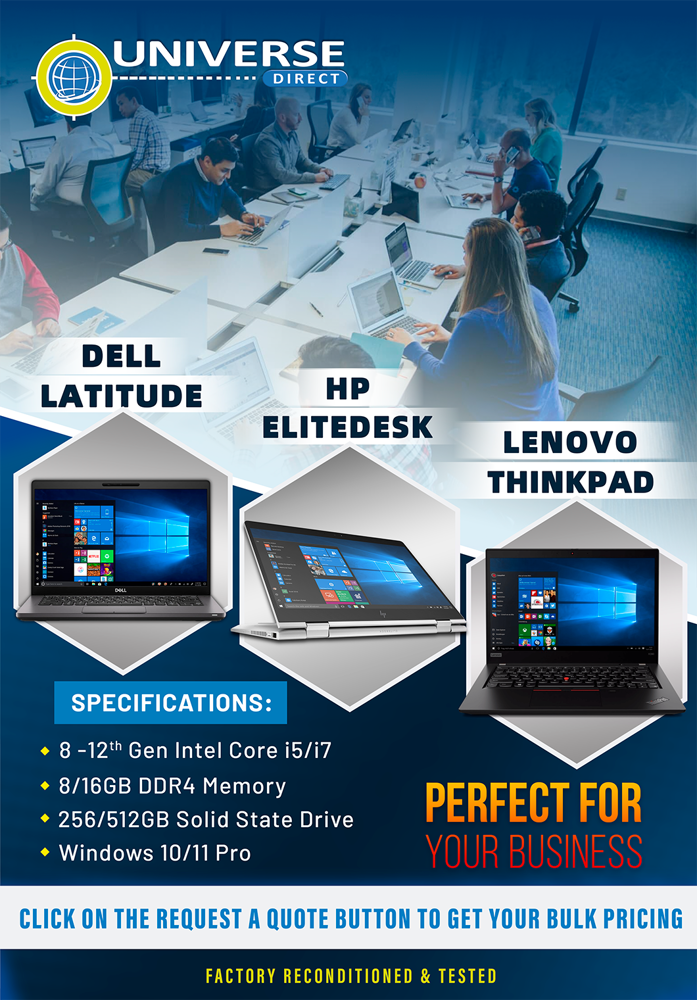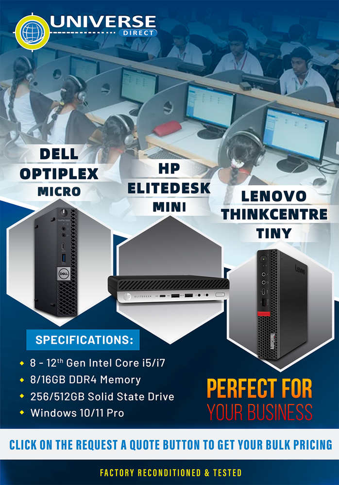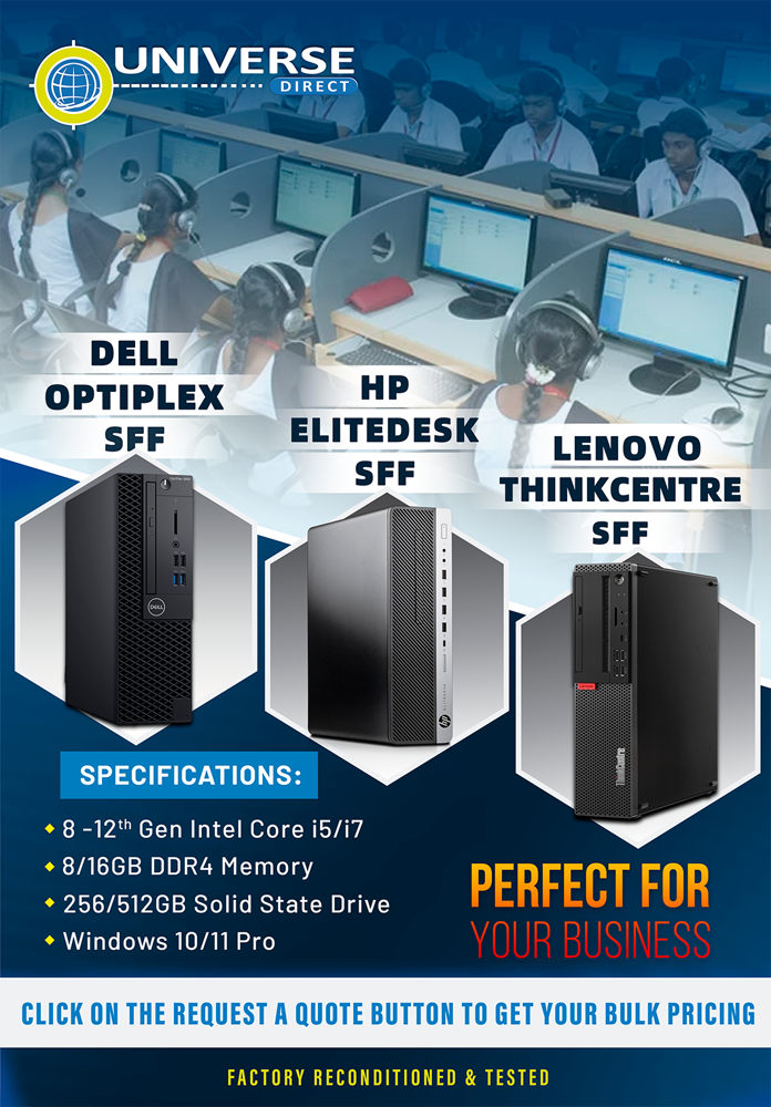 Our devices go through a meticulous inspection and testing process, ensuring that even our reconditione laptops and PCs meet high performance standards. Whether you're looking for Intel Core i5 towers, compact SFF units, or lightweight business laptops, Universe Direct offers wholesale-ready stock at unbeatable value — without compromising on reliability.